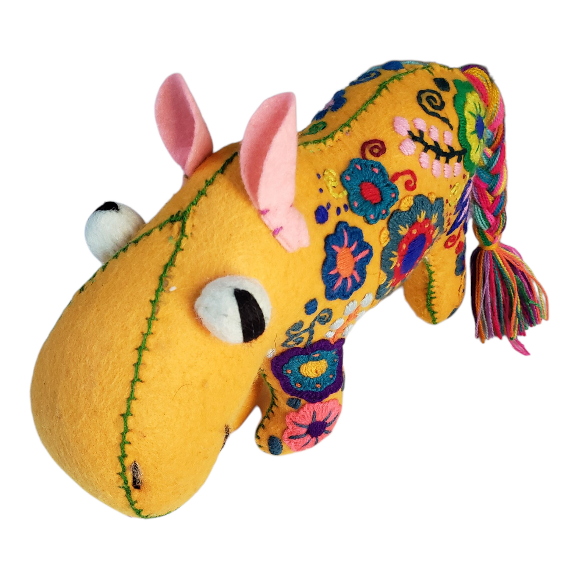The Hippo Animalito is handmade in Chiapas, Mexico. Cute and colorful, each one measures about 9" long, 6" tall, and 3" wide.
