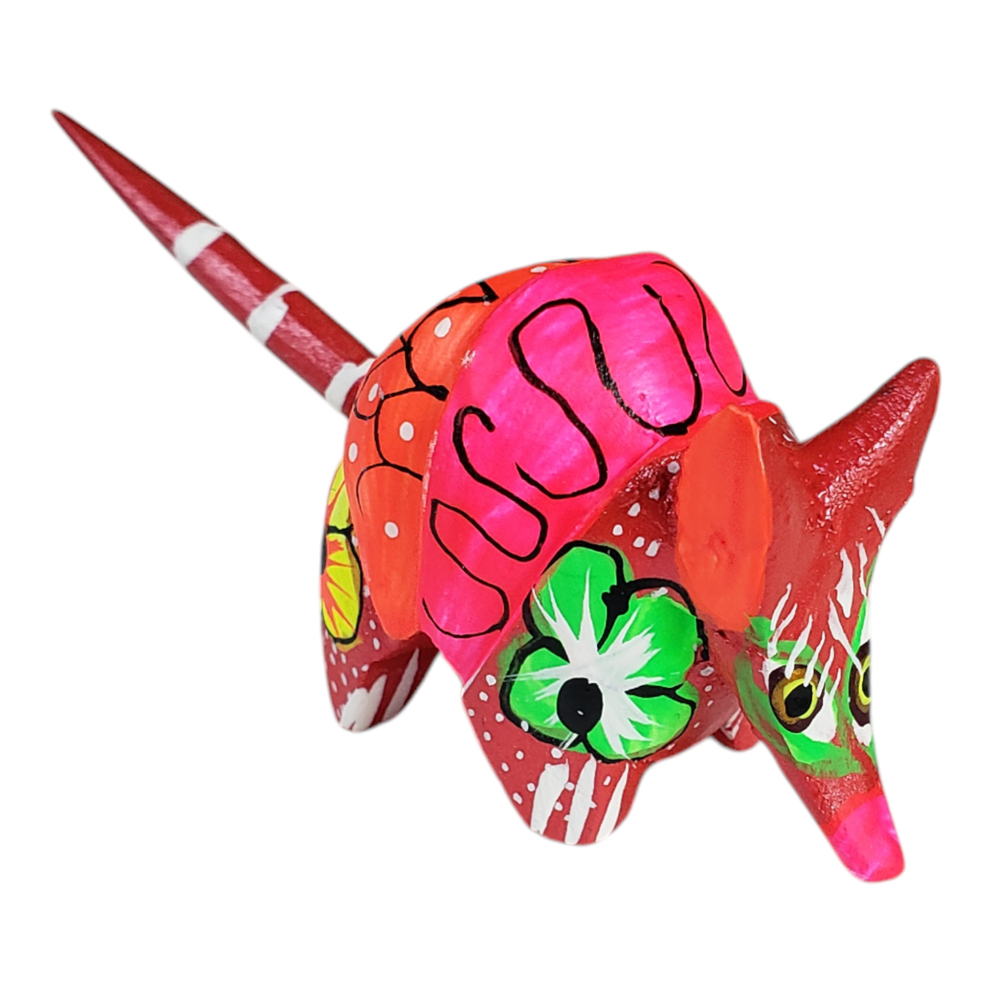 This alebrije is handmade by the artisans of Tilcajete in Oaxaca, Mexico. Each one is hand-carved from copal wood and hand-painted.