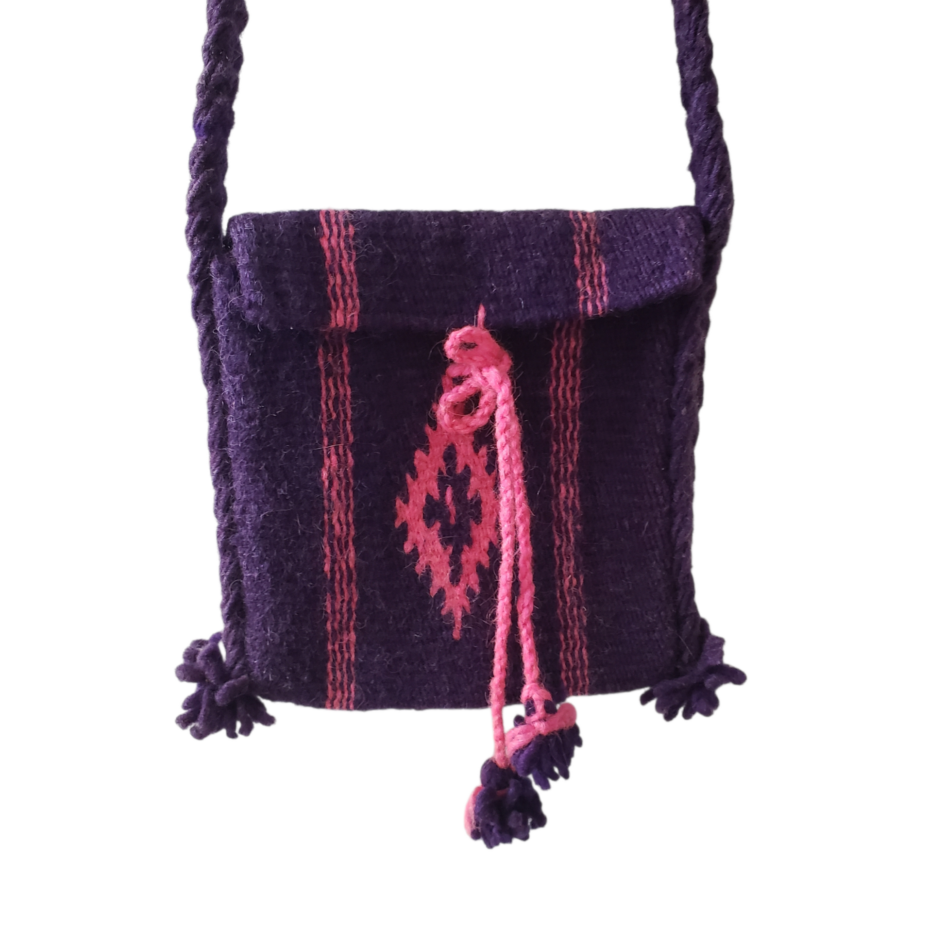 Handcrafted, woven bag made from purple and pink hand-dyed wool in Santa Ana del Valle, Oaxaca, Mexico.